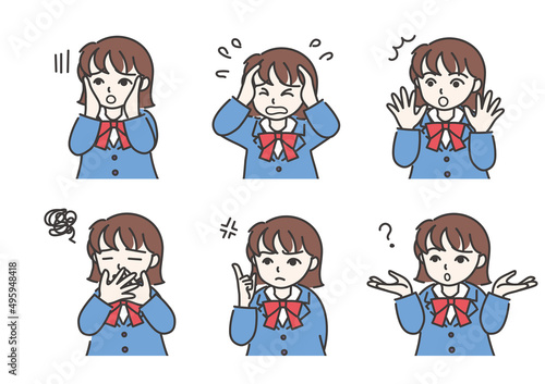 様々な表情を見せる若い女性のイラストセット_A04【カラー/リボン付きの制服】