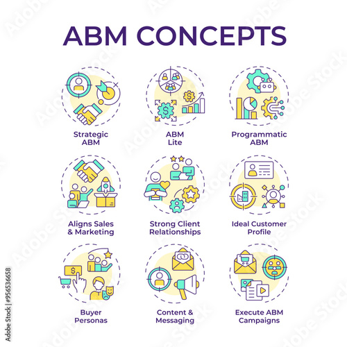 ABM multi color concept icons. Advertisement strategy, personalization. Targeted marketing. Icon pack. Vector images. Round shape illustrations for infographic, presentation. Abstract idea