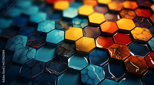 Abstract 3D hexagonal pattern with a glossy texture transitioning from cool blue to warm orange