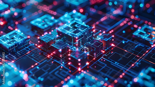 Abstract 3D Illustration of Glowing Cubes and Lines on a Dark Background