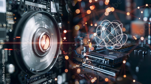 Abstract 3D Motherboard with Glowing Lines and Atom Symbol