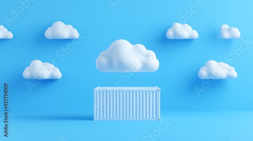 Abstract 3D render of white cloud symbols floating around a cargo container against a blue background, representing cloud computing.