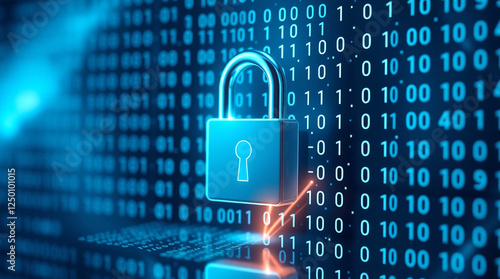 Abstract 3D rendering of a digital lock with binary code floating in space