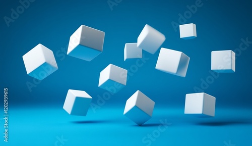 Abstract 3D Rendering of Floating Cubes on a Blue Background