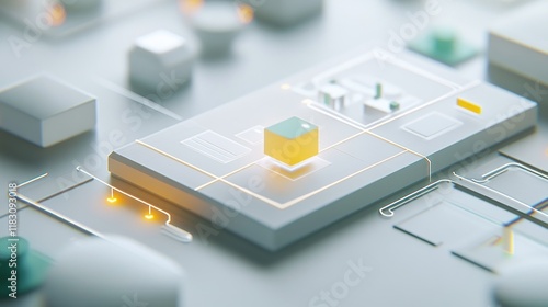 Abstract 3D rendering of interconnected digital elements, showcasing a glowing central cube on a circuit board.