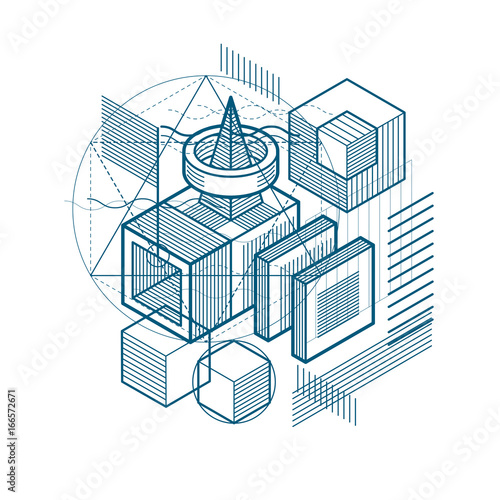 Abstract 3d shapes composition, vector isometric background. Composition of cubes, hexagons, squares, rectangles and different abstract elements.