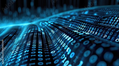 Abstract 3D wave patterns with binary code, symbolizing digital transformation in business