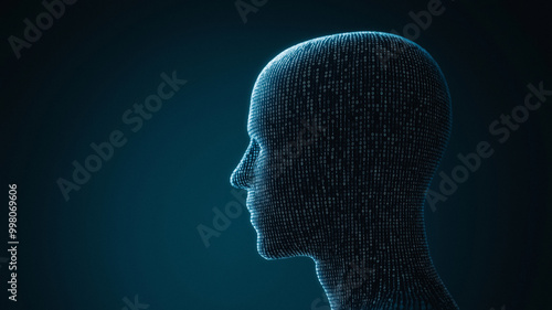 Abstract AI head silhouette filled with binary code streams on a dark backdrop tech and data visualization