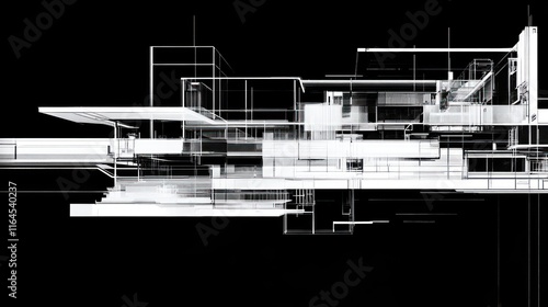 Abstract architectural model, white lines on black background.