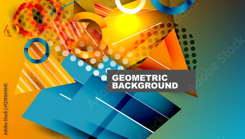 Abstract background - overlapping circles, rectangles, and triangles with vibrant gradients. Semi-transparent shapes create depth and balance