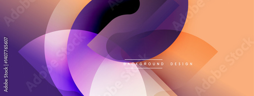 Abstract background features overlapping translucent shapes. Gradient colors blend purple, orange, white creating dynamic visual effect. Modern design element.