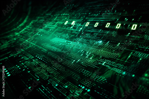 Abstract background of streaming green binary code on a black backdrop, resembling a matrix data flow