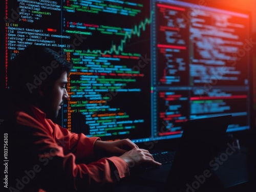 Abstract background of technology and science with computer engineering, blockchain concept, big data analysis, internet communication, teamwork, and programming, coding, information technology