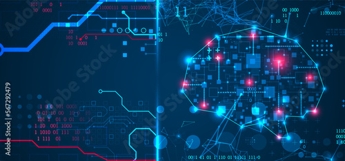 Abstract background on the theme of artificial intelligence. Brain shape with technological elements inside the contour.