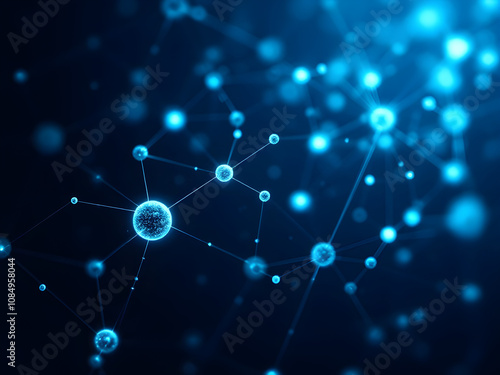 Abstract background with a pattern of glowing atoms, interconnected with thin lines, on a deep blue background.