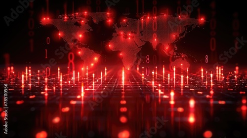 Abstract background with binary digital communication code. Technology network programming symbol and signal with world map. Big data security system on a global scale. Numbers in the red matrix.