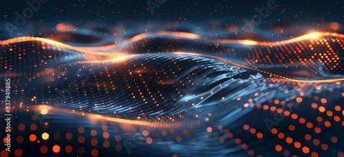 Abstract background with dark blue and orange glowing lines, digital waves of light and dots forming an abstract pattern on the surface of water, representing data technology or global network connect