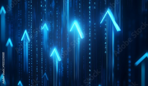 Abstract background with glowing blue arrows pointing upwards, symbolizing growth and success in business or public transport industry on a dark blue background.