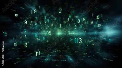 Abstract background with glowing green, emerald and yellow numbers. Random digits in dark space. Cyberspace, computer programming, information coding, mathematics.