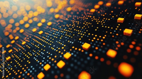 Abstract background with glowing orange and blue squares and dots on a black surface.