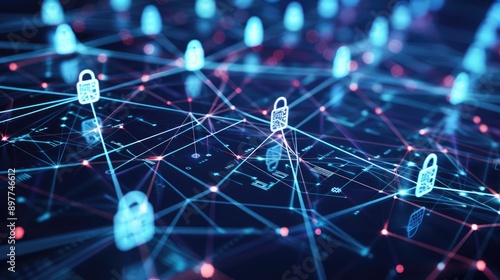 Abstract background with interconnected lines and network security symbols, representing data protection.
