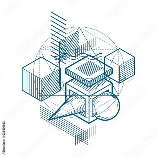 Abstract background with isometric elements, vector linear art with lines and shapes. Cubes, hexagons, squares, rectangles and different abstract elements.