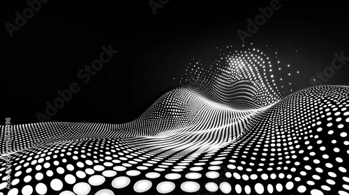 Abstract Black and White Wave Patterns with Dots and Sparkles in a Digital Landscape