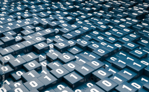 Abstract black cubes with binary code, technology, big data. Machine learning, AI, artificial intelligece, science, code, encryption, one and zero. 3D illustration