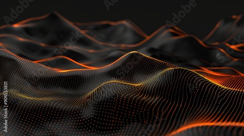 Abstract black dark background with orange dots and lines, creating a wave pattern on the surface of mountains, 3D rendering, white background, high resolution