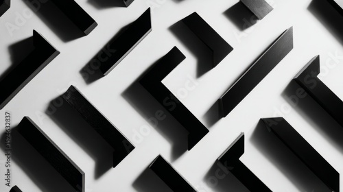 Abstract black directional symbols with sharp shadows on white, geometric precision in modern design