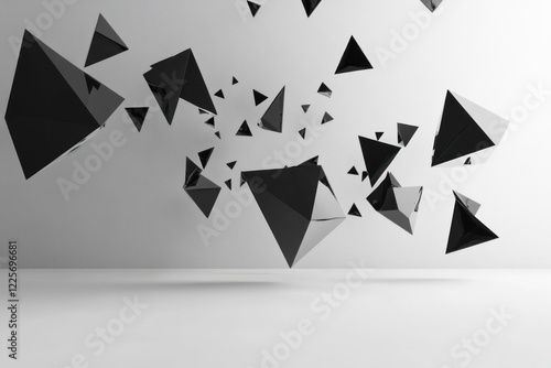 Abstract black pyramids floating in a white room.