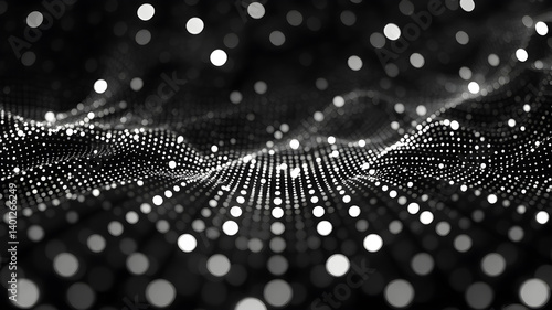 Abstract Black Technology Digital Network Bokeh Lights Background Perspective . Futuristic Data Connection Monochrome Energy Grid Pattern