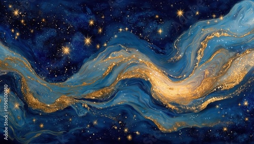 Abstract Blue and Gold Marbled Art with Starry Elements