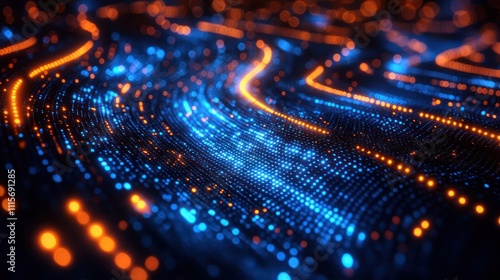 Abstract blue and orange glowing particle wave.