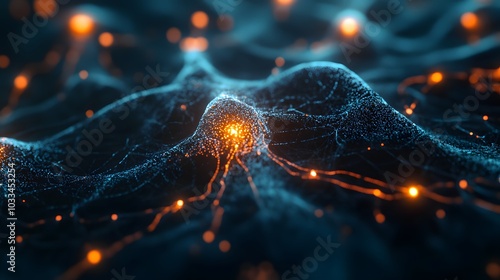 Abstract Blue and Orange Particle Landscape with Glowing Spots