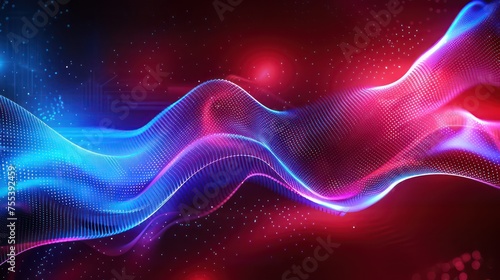Abstract blue and red harmony tech background with digital waves, explosion, dynamic network system, artificial neural connections, AI quantum computing global intelligence