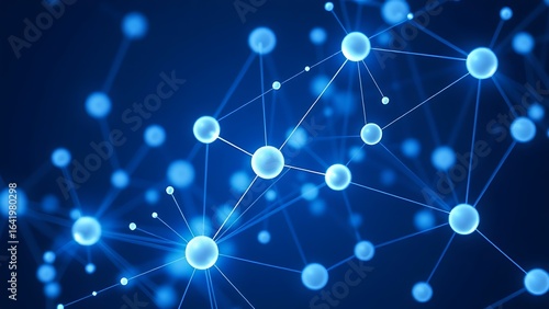 Abstract blue and white interconnected spheres with glowing nodes, symbolizing a digital network on a dark background.
