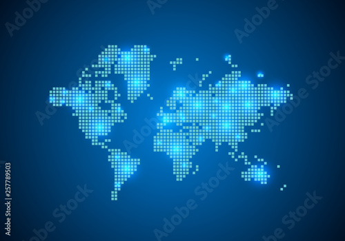 Abstract blue background with map, internet line, connected points. map with dot nodes. Global network connection concept. Wire frame 3D mesh polygonal network line. vector.