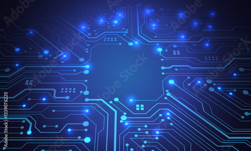 Abstract blue circuit board technology connected lines electronics elements computer motherboard chip processor semiconductor digital background vector