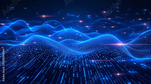 Abstract Blue Data Wave Background: Futuristic Digital Landscape with Glowing Particles and Technology Visualization