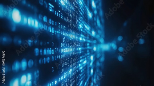 Abstract blue digital code background with blurred lights.