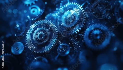 Abstract blue gears rotating in dark background.