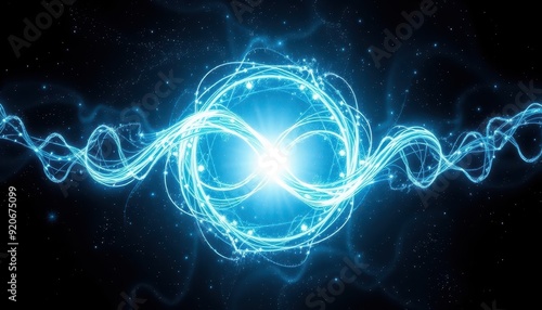 Abstract blue glowing infinity symbol with particles.