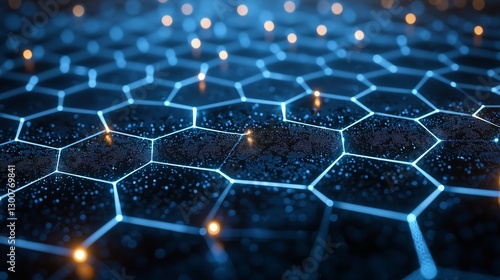 Abstract Blue Hexagonal Grid with Light Points and Sparkling Elements