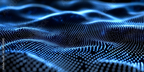 Abstract Blue Particles Flowing Smoothly in a Dark Digital Space Background.