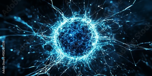 Abstract blue sphere with glowing light streams.