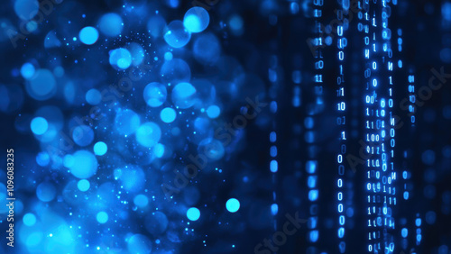 Abstract blue technology background with binary code and bokeh lights. Ideal for projects related to cybersecurity, data science, and digital innovation.