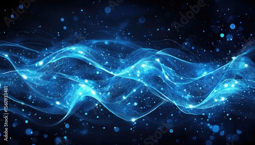 Abstract blue waves, dark background, glowing particles. Potential use Background graphic