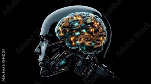 Abstract Brain Brain with Circuits Futuristic robot head with a glowing brain visible through a transparent skull, symbolizing artificial intelligence, robotics, and the future of technology.