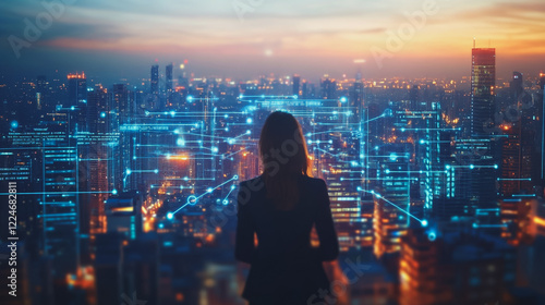 Abstract business woman stands on Smart digital Innovation city with connection network reciprocity over the twilight cityscape. of future wireless digital city and social media networking systems